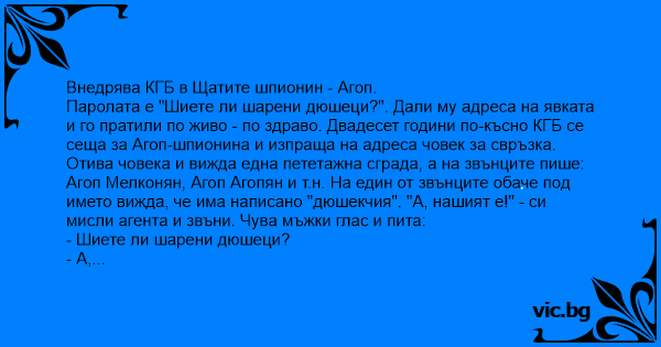 Паролата е "Шиете ли шарени дюшеци?". Дали му адреса на явката и го пратили по живо - по здраво. Двадесет години по-късно КГБ се сеща за Агоп-шпионина и изпраща на адреса човек за свръзка. Отива човека и вижда една пететажна сграда, а на звънците пише: Агоп Мелконян, Агоп Агопян и т.н. На един от звънците обаче под името вижда, че има написано "дюшекчия". "А, нашият е!" - си мисли агента и звъни. Чува мъжки глас и пита: