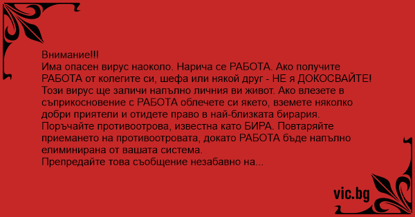 Има опасен вирус наоколо. Нарича се РАБОТА. Ако получите РАБОТА от колегите си, шефа или някой друг - НЕ я ДОКОСВАЙТЕ!