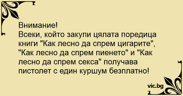Всеки, който закупи цялата поредица книги "Как лесно да спрем цигарите", "Как лесно да спрем пиенето" и "Как лесно да спрем cekca" получава пистолет с един куршум безплатно!