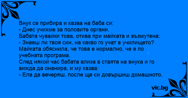 След някой час бабата влиза в стаята на внука и го вижда да онанира, и му казва:
