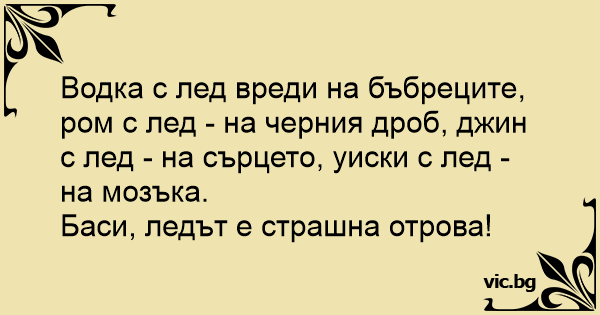 Vodka + jég = károsítja a vesét. Whisky + jég = károsítja a szívet. Gin + jég = károsítja az agyat. Tudtam, az a rohadt jég!