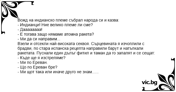 Вожд на индианско племе събрал народа си и казва: - Индианци! Ние велико племе ли сме? - Даааааааа! - Е тогава защо нямаме атомна ракета? - Ми да си направим... Взели и отсекли най-високата секвоя. Сърцевината я изчоплили с брадви, по стара испанска рецепта направили барут и натъпкали ракетата. Пуснали един дълъг фитил и таман да го запалят и се сещат: - Къде ще я изстреляме? - Ми по Ереван. - Що по Ереван бре? - Ми щот така или иначе друго не знам... Така и направили – написали "По Ереван" на ракетата и палнали фитила, събрали се наоколо, гледат... Чува се БУУУМ... дим, пушек, всички се търкалят. Вожда без ръка, без крак се надига, гледа и казва: - Бacи мамата, представяте ли си в Ереван какво е!
