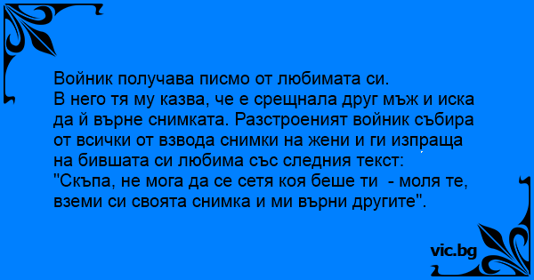 В него тя му казва, че е срещнала друг мъж и иска да й върне снимката. Разстроеният войник събира от всички от взвода снимки на жени и ги изпраща на бившата си любима със следния текст:
