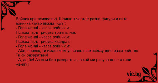 Войник при психиатър. Шринкът чертае разни фигури и пита войника какво вижда. Кръг: