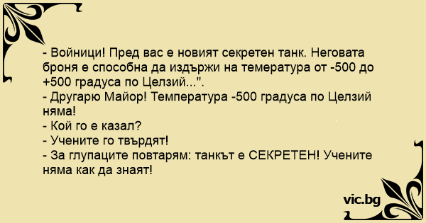 - Войници! Пред вас е новият секретен танк. Неговата броня е способна да издържи на темература от -500 до +500 градуса по Целзий...".