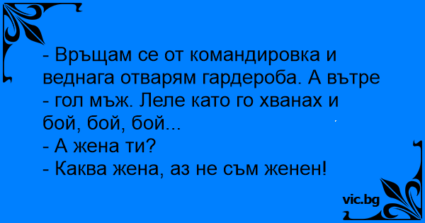 - Връщам се от командировка и веднага отварям гардероба. А вътре - гол мъж. Леле като го хванах и бой, бой, бой...