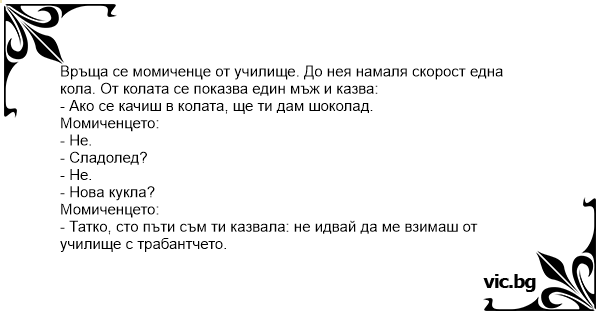 Връща се момиченце от училище. До нея намаля скорост една кола. От колата се показва един мъж и казва: