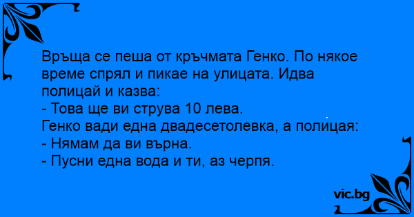 Връща се пеша от кръчмата Генко. По някое време спрял и пикае на улицата. Идва полицай и казва: