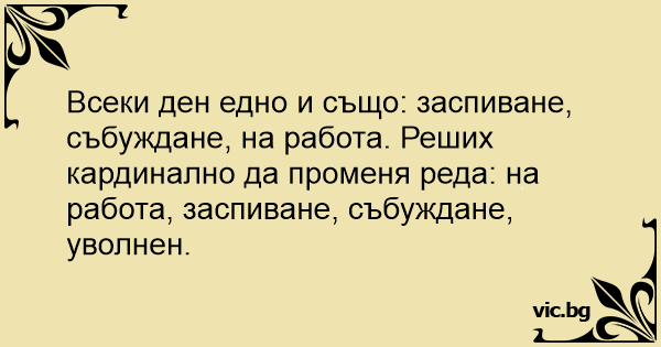 Всеки ден едно и също: заспиване, събуждане, на работа. Реших кардинално да променя реда: на работа, заспиване, събуждане, уволнен.