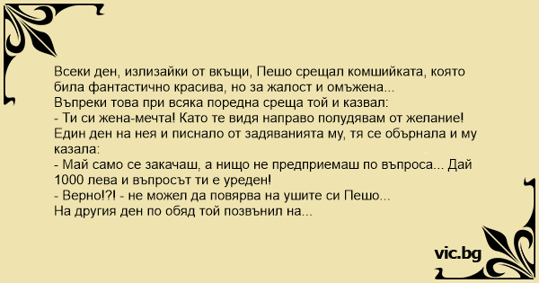 На другия ден по обяд той позвънил на вратата на комшийката и когато тя отворила и подал 1000 лева. Готината комшийка ги прибрала и му дала всичко от себе си...