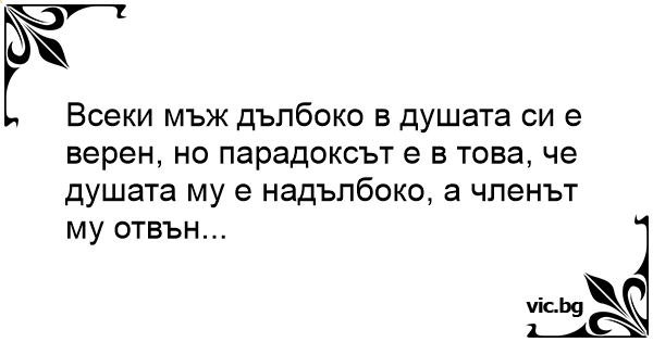 Всеки мъж дълбоко в душата си е верен, но парадоксът е в това, че душата му е надълбоко, а члeнъt му отвън...