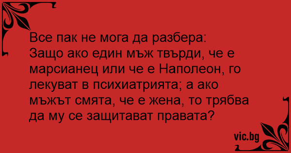 Защо ако един мъж твърди, че е марсианец или че е Наполеон, го лекуват в психиатрията; а ако мъжът смята, че е жена, то трябва да му се защитават правата?
