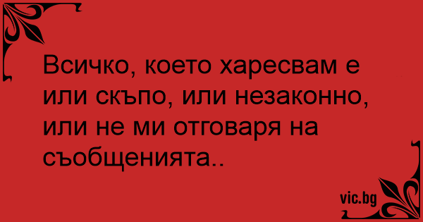 Всичко, което харесвам е или скъпо, или незаконно, или не ми отговаря на съобщенията..