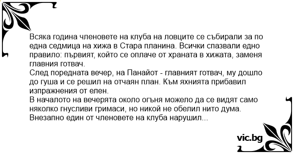 Всяка година членовете на клуба на ловците се събирали за по една седмица на хижа в Стара планина. Всички спазвали едно правило: първият, който се оплаче от храната в хижата, заменя главния готвач.