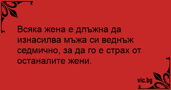 Всяка жена е длъжна да изнасилва мъжа си веднъж седмично, за да го е страх от останалите жени.