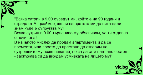"Всяка сутрин в 9.00 съседът ми, който е на 90 години и страда от Алцхаймер, звъни на вратата ми да пита дали знам къде е съпругата му!