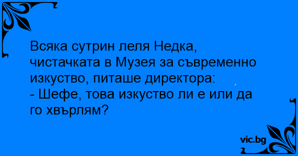 Всяка сутрин леля Недка, чистачката в Музея за съвременно изкуство, питаше директора: