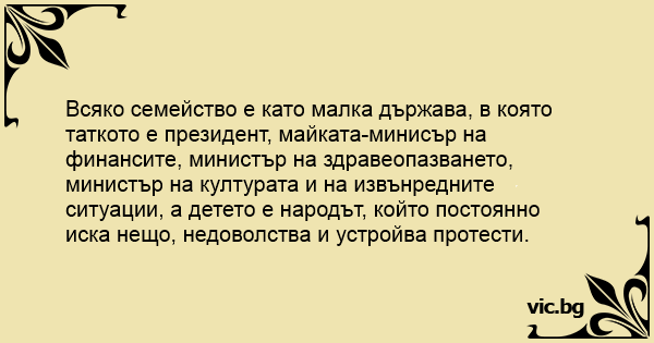 Всяко семейство е като малка държава, в която таткото е президент, майката-минисър на финансите, министър на здравеопазването, министър на културата и на извънредните ситуации, а детето е народът, който постоянно иска нещо, недоволства и устройва протести.