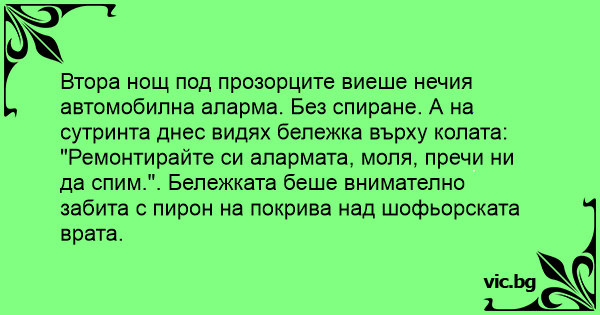 Втора нощ под прозорците виеше нечия автомобилна аларма. Без спиране. А на сутринта днес видях бележка върху колата: