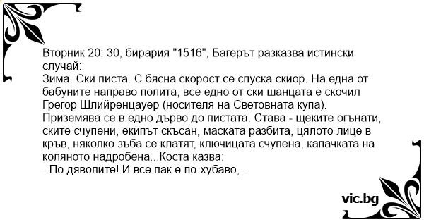 Зима. Ски писта. С бясна скорост се спуска скиор. На една от бабуните направо полита, все едно от ски шанцата е скочил Грегор Шлийренцауер (носителя на Световната купа). Приземява се в едно дърво до пистата. Става - щеките огънати, ските счупени, екипът скъсан, маската разбита, цялото лице в кръв, няколко зъба се клатят, ключицата счупена, капачката на коляното надробена...Коста казва: