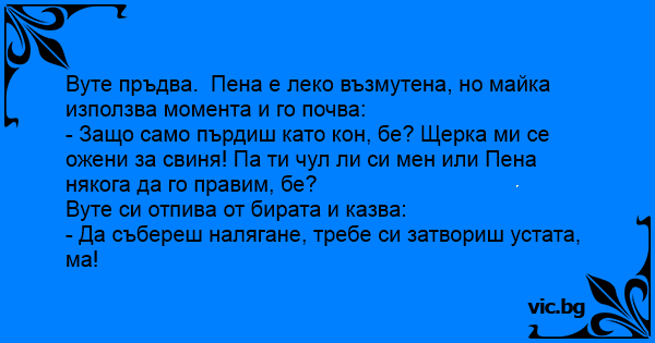 - Защо само пърдиш като кон, бе? Щерка ми се ожени за свиня! Па ти чул ли си мен или Пена някога да го правим, бе?
