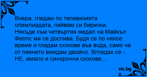 Някъде към четвъртия медал на Майкъл Фелпс ми се доспива. Будя се по някое време и гледам скокове във вода, само че от пиенето виждам двойно. Вгледах се - НЕ, имало и синхронни скокове...