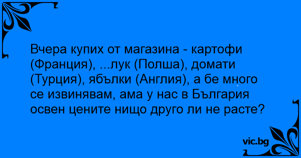 Вчера купих от магазина - картофи (Франция), ...лук (Полша), домати (Турция), ябълки (Англия), а бе много се извинявам, ама у нас в България освен цените нищо друго ли не расте?
