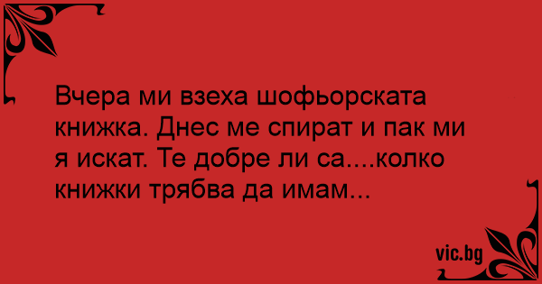 Вчера ми взеха шофьорската книжка. Днес ме спират и пак ми я искат. Те добре ли са....колко книжки трябва да имам...