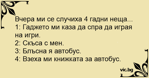 • Вицове от Facebook от нашата страница https://www.facebook.com/www.vic.bg