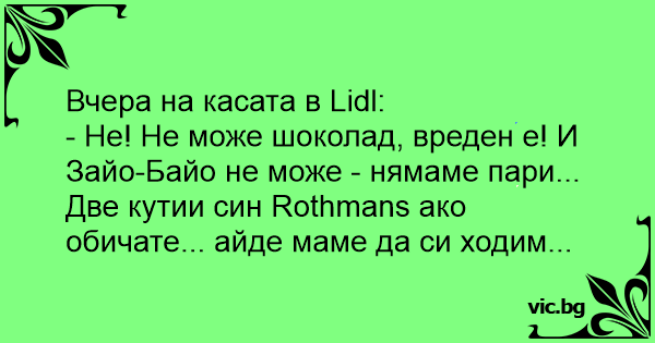 - Не! Не може шоколад, вреден е! И Зайо-Байо не може - нямаме пари... Две кутии син Rothmans ако обичате... айде маме да си ходим...