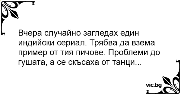 Вчера случайно загледах един индийски сериал. Трябва да взема пример от тия пичове. Проблеми до гушата, а се скъсаха от танци...