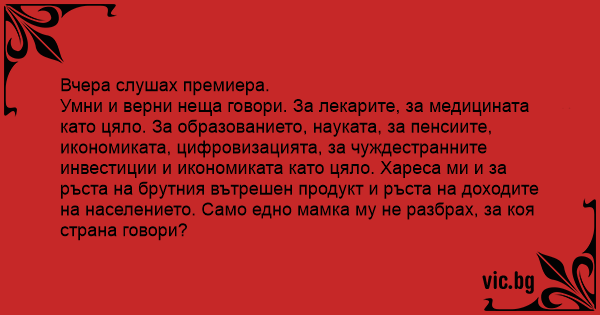 Умни и верни неща говори. За лекарите, за медицината като цяло. За образованието, науката, за пенсиите, икономиката, цифровизацията, за чуждестранните инвестиции и икономиката като цяло. Хареса ми и за ръста на брутния вътрешен продукт и ръста на доходите на населението. Само едно мамка му не разбрах, за коя страна говори?