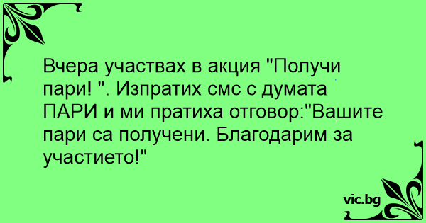 Вчера участвах в акция "Получи пари! ". Изпратих смс с думата ПАРИ и ми пратиха отговор:"Вашите пари са получени. Благодарим за участието!"