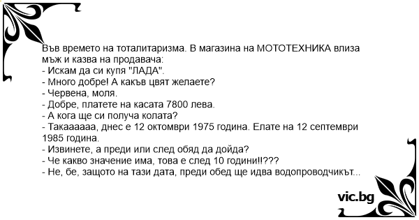 Στη Σοβιετική Ένωση ένας τύπος πάει να παραγγείλει ένα αυτοκίνητο και ρωτάει πότε θα τον ειδοποιήσουνε. "Σε δέκα χρόνια", απαντά ο υπάλληλος. "Εντάξει", λέει ο άλλος, "αλλά πότε, πρωί ή απόγευμα";...
