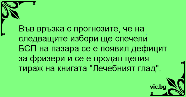 Във връзка с прогнозите, че на следващите избори ще спечели БСП на пазара се е появил дефицит за фризери и се е продал целия тираж на книгата "Лечебният глад".