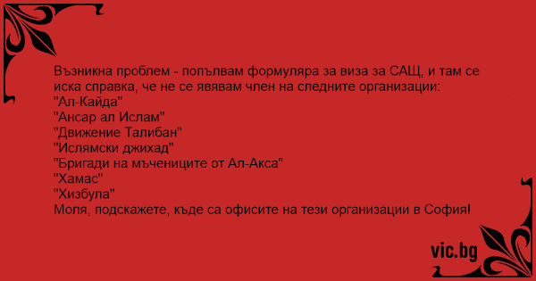 Възникна проблем - попълвам формуляра за виза за САЩ, и там се иска справка, че не се явявам члeн на следните организации: