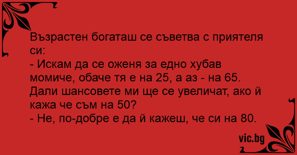 - Искам да се оженя за едно хубав момиче, обаче тя е на 25, а аз - на 65. Дали шансовете ми ще се увеличат, ако й кажа че съм на 50?