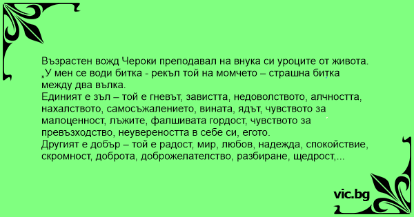 Внукът се замислил за минута и после попитал „Дядо, а кой вълк ще победи?“
