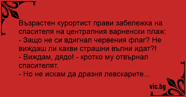 - Защо не си вдигнал червения флаг? Не виждаш ли какви страшни вълни идат?!