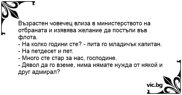 Възрастен човечец влиза в министерството на отбраната и изявява желание да постъпи във флота.