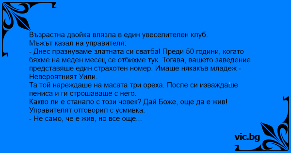 - Днес празнуваме златната си сватба! Преди 50 години, когато бяхме на меден месец се отбихме тук. Тогава, вашето заведение представяше един страхотен номер. Имаше някакъв младеж - Невероятният Уили.