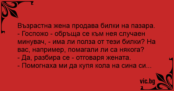 - Госпожо - обръща се към нея случаен минувач, - има ли полза от тези билки? На вас, например, помагали ли са някога?