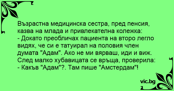 - Докато преобличах пациента на второ легло видях, че си е татуирал на половия члeн думата "Адам". Ако не ми вярваш, иди и виж.