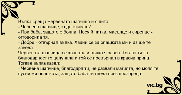 - Червена шапчице, благодаря ти, че развали магията, но моля те пусни ми опашката, защото баба ти гледа през прозореца.