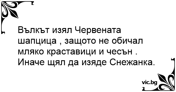 Вълкът изял Червената шапцица , защото не обичал мляко краставици и чесън . Иначе щял да изяде Снежанка.