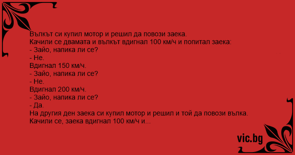 Качили се двамата и вълкът вдигнал 100 км/ч и попитал заека: