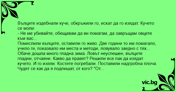 Помислили вълците, оставили го живо. Две години то им помагало, учило ги, показвало им места и методи, ловувало заедно с тях... Обаче дошла много гладна зима. Ловът неуспешен, вълците гладни, отчаяни. Какво да правят? Решили все пак да изядат кучето. И го изяли. Костите погребали. Поставили надгробна плоча. Чудят се как да я подпишат, от кого? "От приятели"? Какви приятели, като са го изяли? "От враговете?" Не става - две години заедно ловували, гръб до гръб, всичко точно... Помислили, помислили и написали: