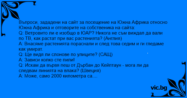 Въпроси, зададени на сайт за посещение на Южна Африка относно Южна Африка и отговорите на собственика на сайта: