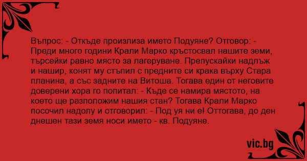 Въпрос: - Откъде произлиза името Подуяне? Отговор: - Преди много години Крали Марко кръстосвал нашите земи, търсейки равно място за лагеруване. Препускайки надлъж и нашир, конят му стъпил с предните си крака върху Стара планина, а със задните на Витоша. Тогава един от неговите доверени хора го попитал: - Къде се намира мястото, на което ще разположим нашия стан? Тогава Крали Марко посочил надолу и отговорил: - Под уя ни е! Оттогава, до ден днешен тази земя носи името - кв. Подуяне.