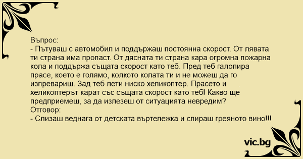 - Пътуваш с автомобил и поддържаш постоянна скорост. От лявата ти страна има пропаст. От дясната ти страна кара огромна пожарна кола и поддържа същата скорост като теб. Пред теб галопира прасе, което е голямо, колкото колата ти и не можеш да го изпревариш. Зад теб лети ниско хеликоптер. Прасето и хеликоптерът карат със същата скорост като теб! Какво ще предприемеш, за да излезеш от ситуацията невредим?